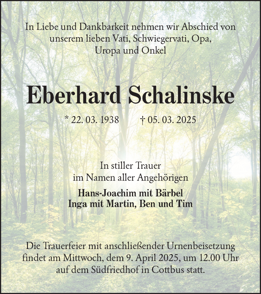 Hier finden Sie alle Traueranzeigen aus der Zeitung, die bisher für Eberhard Schalinske erschienen sind. Weitere Traueranzeigen, die in der Zeitung erscheinen, werden hier ebenfalls aufgelistet