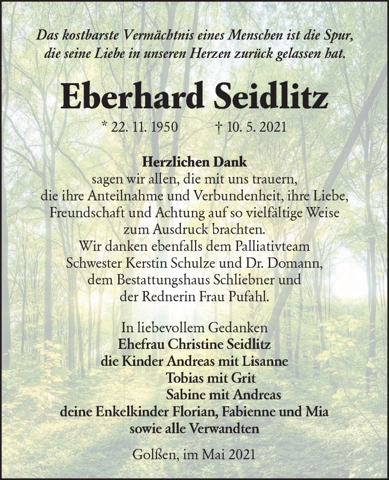 Hier finden Sie alle Traueranzeigen aus der Zeitung, die bisher für Eberhard Seidlitz erschienen sind. Weitere Traueranzeigen, die in der Zeitung erscheinen, werden hier ebenfalls aufgelistet