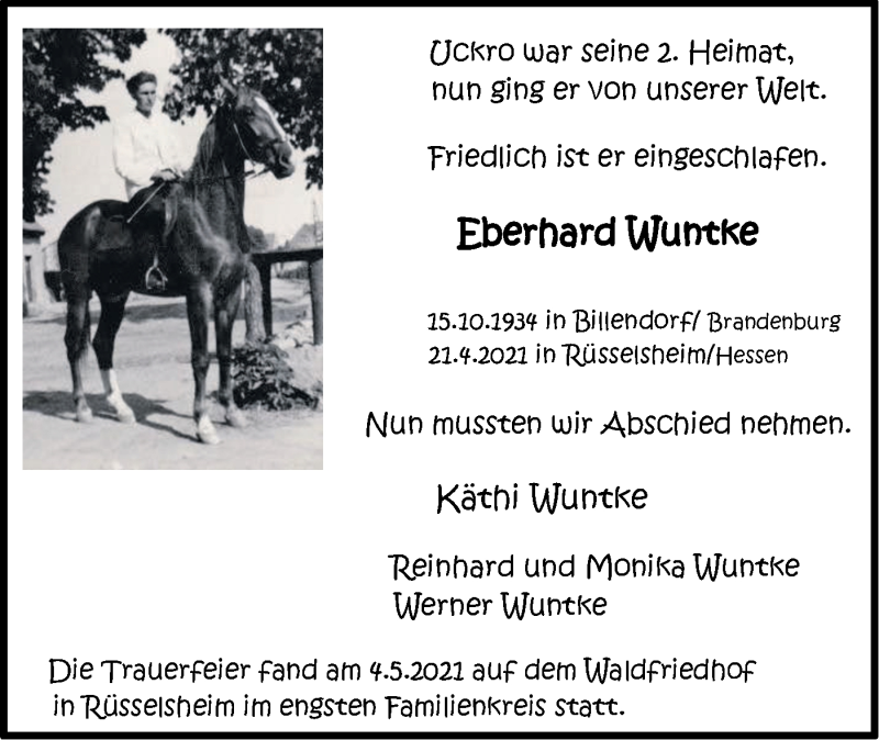 Hier finden Sie alle Traueranzeigen aus der Zeitung, die bisher für Eberhard WuntKe erschienen sind. Weitere Traueranzeigen, die in der Zeitung erscheinen, werden hier ebenfalls aufgelistet