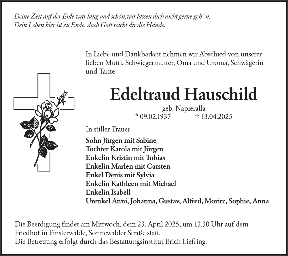 Hier finden Sie alle Traueranzeigen aus der Zeitung, die bisher für Edeltraud Hauschild erschienen sind. Weitere Traueranzeigen, die in der Zeitung erscheinen, werden hier ebenfalls aufgelistet