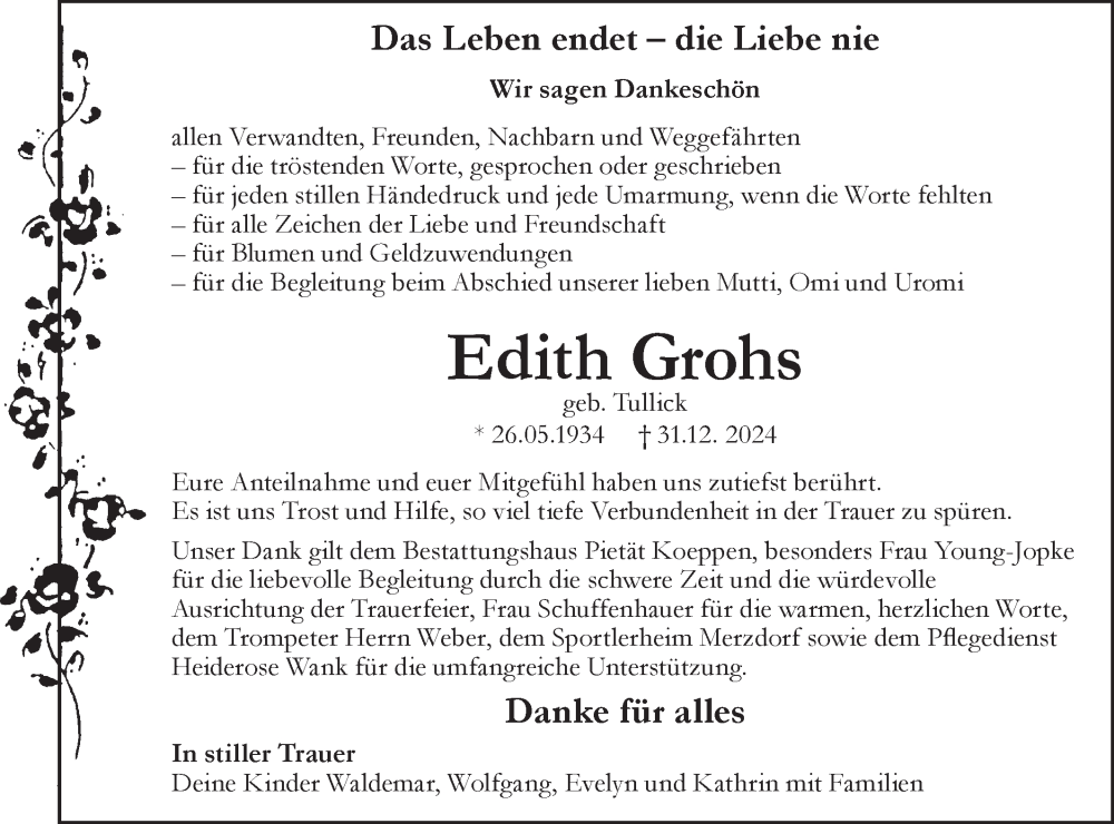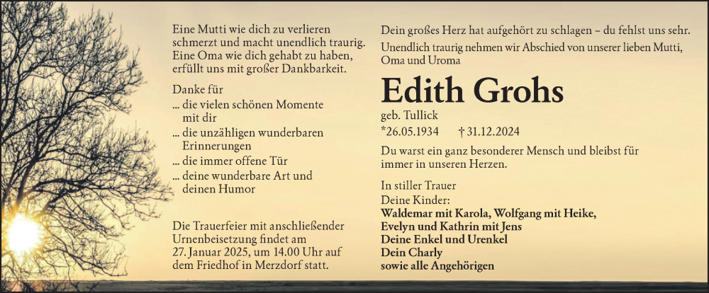 Hier finden Sie alle Traueranzeigen aus der Zeitung, die bisher für Edith Grohs erschienen sind. Weitere Traueranzeigen, die in der Zeitung erscheinen, werden hier ebenfalls aufgelistet