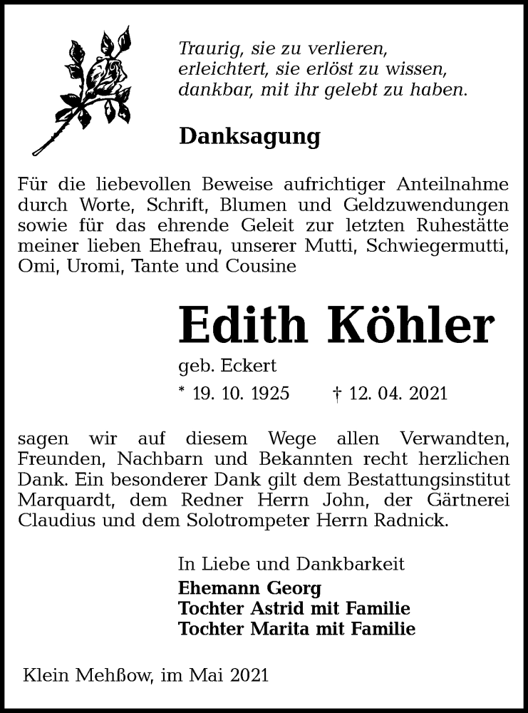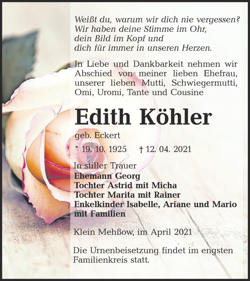 Hier finden Sie alle Traueranzeigen aus der Zeitung, die bisher für Edith Köhler erschienen sind. Weitere Traueranzeigen, die in der Zeitung erscheinen, werden hier ebenfalls aufgelistet