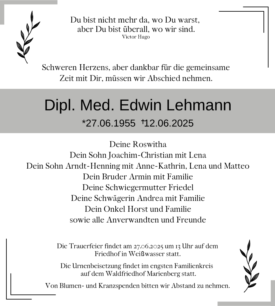 Hier finden Sie alle Traueranzeigen aus der Zeitung, die bisher für Edwin Lehmann erschienen sind. Weitere Traueranzeigen, die in der Zeitung erscheinen, werden hier ebenfalls aufgelistet