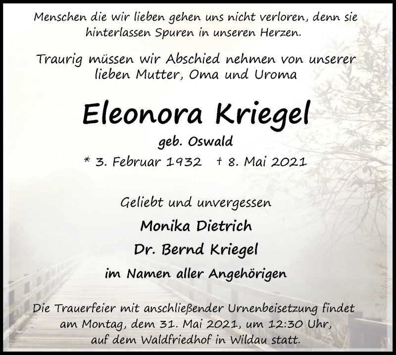 Hier finden Sie alle Traueranzeigen aus der Zeitung, die bisher für Eleonora Kriegel erschienen sind. Weitere Traueranzeigen, die in der Zeitung erscheinen, werden hier ebenfalls aufgelistet