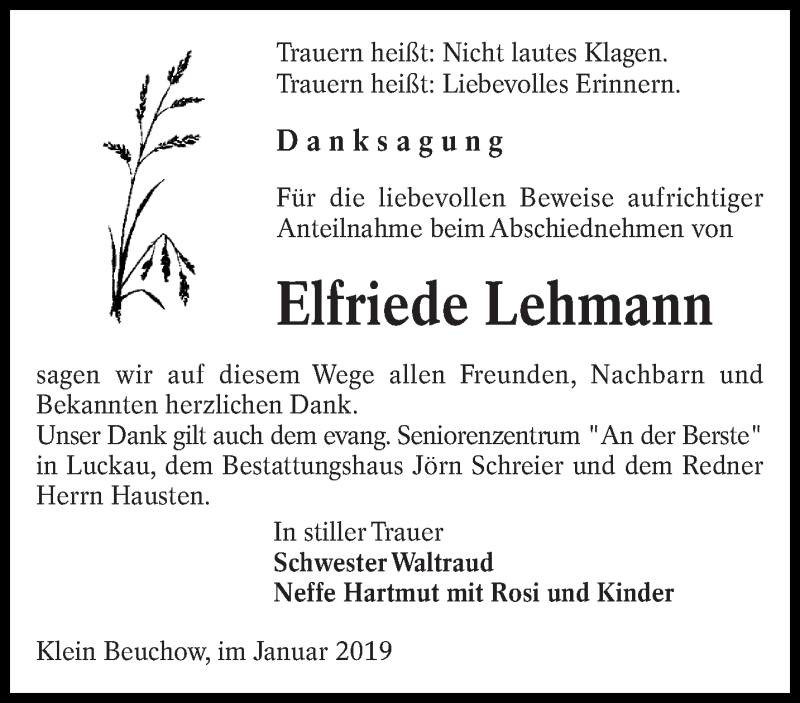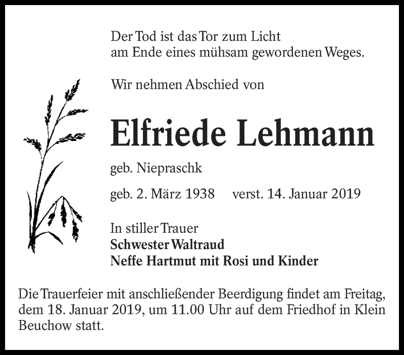 Hier finden Sie alle Traueranzeigen aus der Zeitung, die bisher für Elfriede Lehmann erschienen sind. Weitere Traueranzeigen, die in der Zeitung erscheinen, werden hier ebenfalls aufgelistet