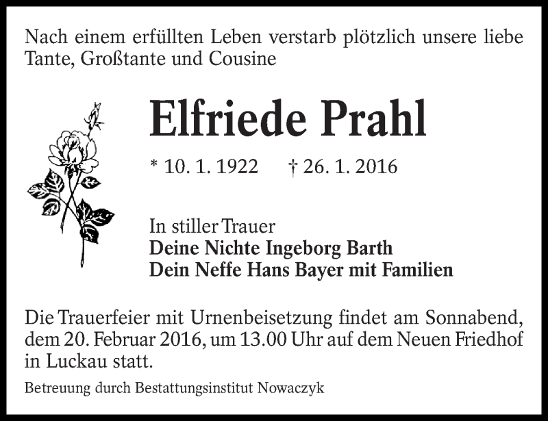 Hier finden Sie alle Traueranzeigen aus der Zeitung, die bisher für Elfriede Prahl erschienen sind. Weitere Traueranzeigen, die in der Zeitung erscheinen, werden hier ebenfalls aufgelistet