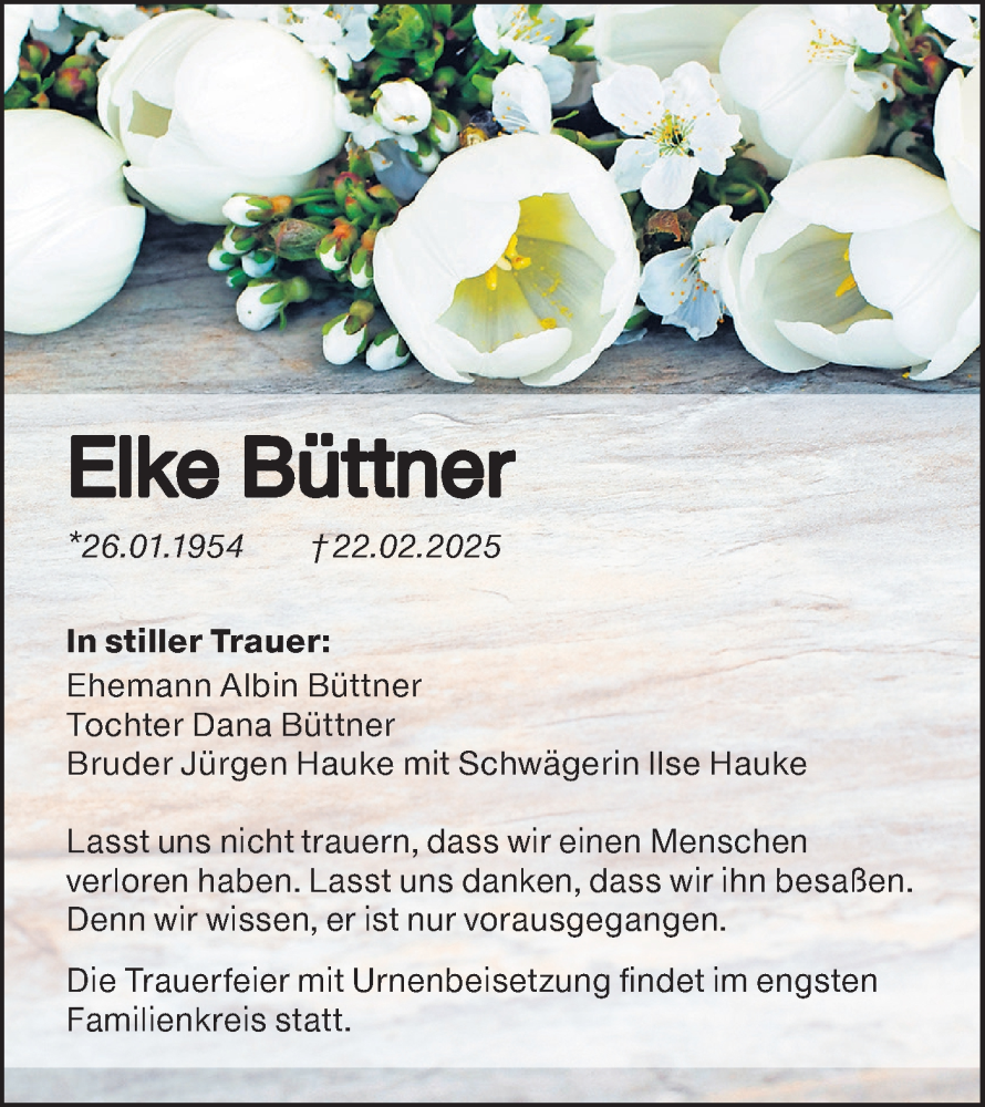Hier finden Sie alle Traueranzeigen aus der Zeitung, die bisher für Elke Büttner erschienen sind. Weitere Traueranzeigen, die in der Zeitung erscheinen, werden hier ebenfalls aufgelistet