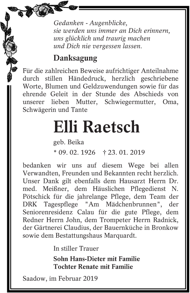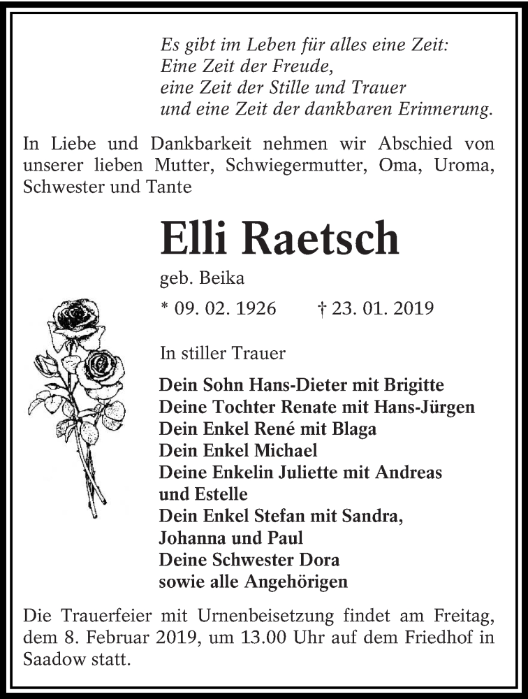 Hier finden Sie alle Traueranzeigen aus der Zeitung, die bisher für Elli Raetsch erschienen sind. Weitere Traueranzeigen, die in der Zeitung erscheinen, werden hier ebenfalls aufgelistet