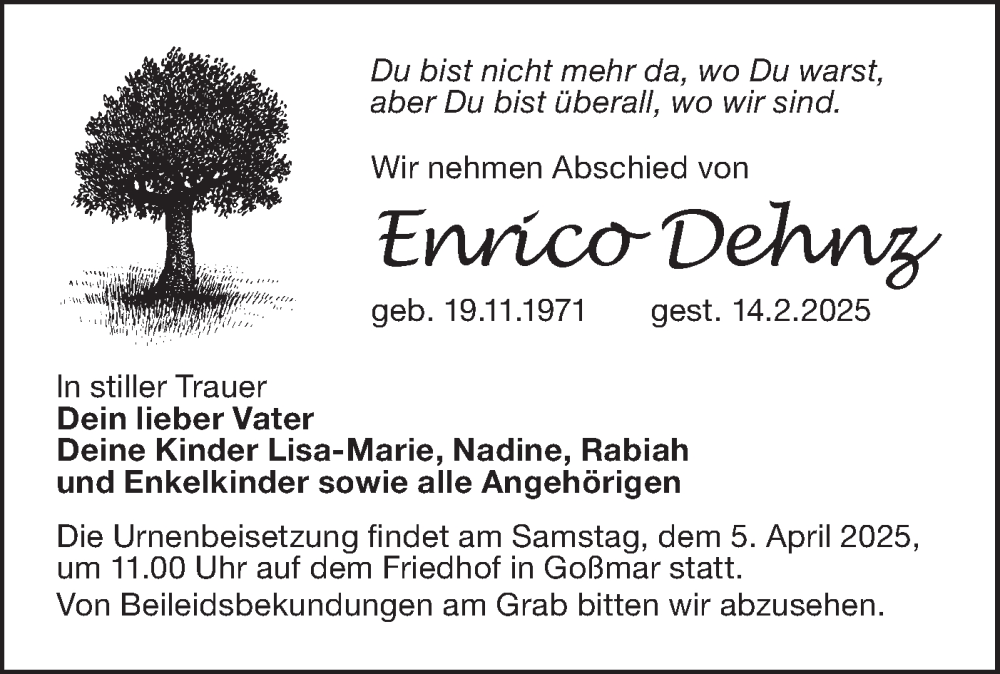 Hier finden Sie alle Traueranzeigen aus der Zeitung, die bisher für Enrico Dehnz erschienen sind. Weitere Traueranzeigen, die in der Zeitung erscheinen, werden hier ebenfalls aufgelistet