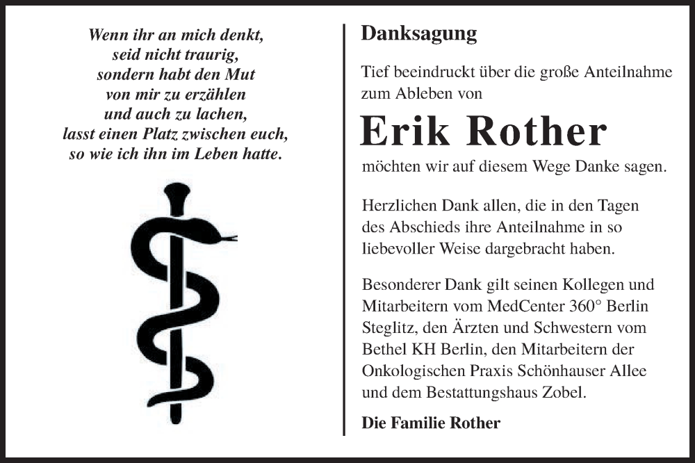 Hier finden Sie alle Traueranzeigen aus der Zeitung, die bisher für Erik Rother erschienen sind. Weitere Traueranzeigen, die in der Zeitung erscheinen, werden hier ebenfalls aufgelistet