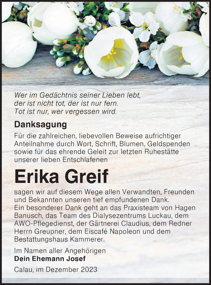 Hier finden Sie alle Traueranzeigen aus der Zeitung, die bisher für Erika Greif erschienen sind. Weitere Traueranzeigen, die in der Zeitung erscheinen, werden hier ebenfalls aufgelistet