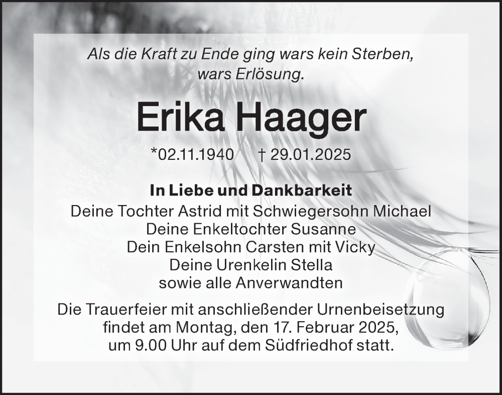 Hier finden Sie alle Traueranzeigen aus der Zeitung, die bisher für Erika Haager erschienen sind. Weitere Traueranzeigen, die in der Zeitung erscheinen, werden hier ebenfalls aufgelistet