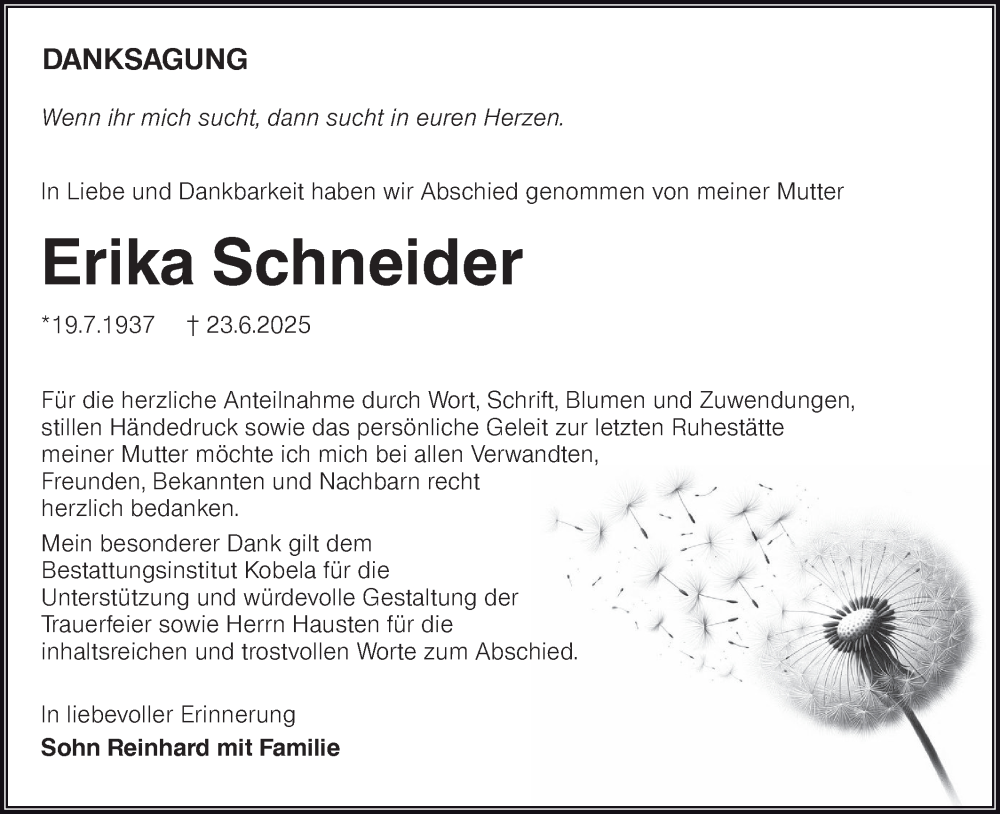 Hier finden Sie alle Traueranzeigen aus der Zeitung, die bisher für Erika Schneider erschienen sind. Weitere Traueranzeigen, die in der Zeitung erscheinen, werden hier ebenfalls aufgelistet