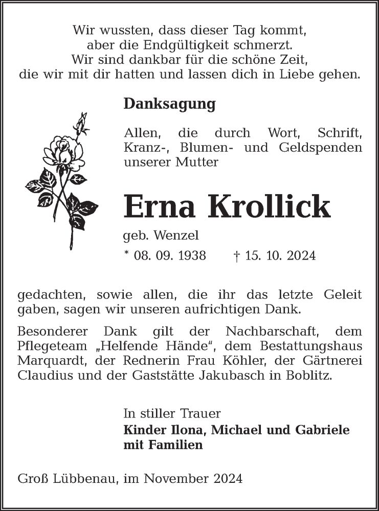 Hier finden Sie alle Traueranzeigen aus der Zeitung, die bisher für Erna Krollick erschienen sind. Weitere Traueranzeigen, die in der Zeitung erscheinen, werden hier ebenfalls aufgelistet