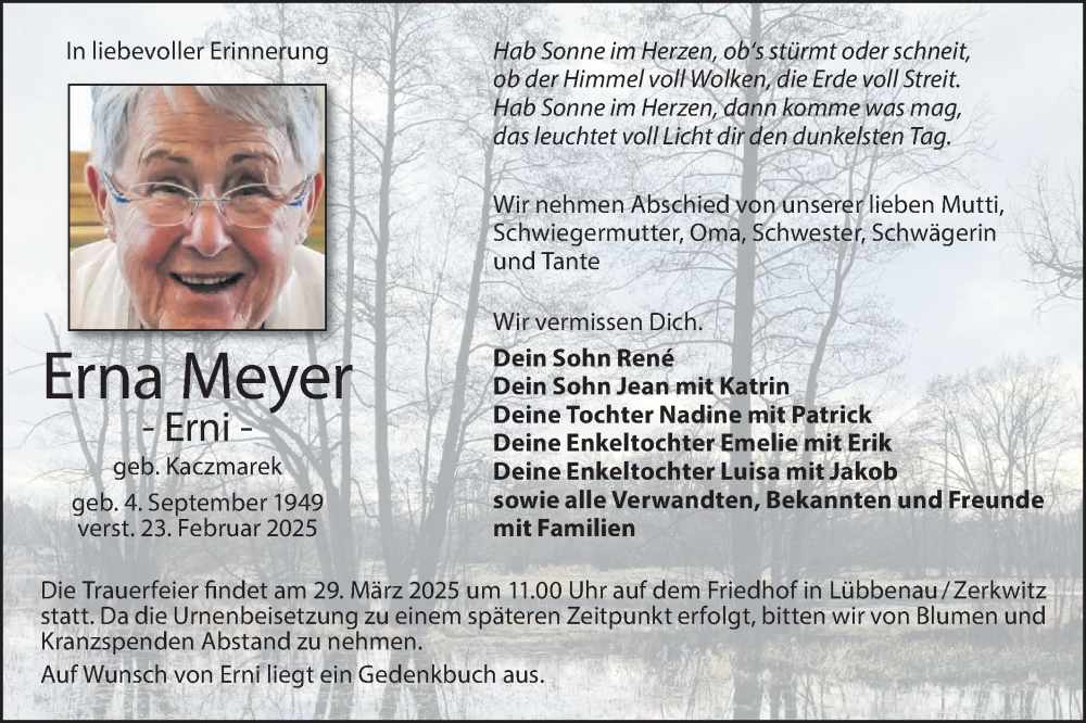 Hier finden Sie alle Traueranzeigen aus der Zeitung, die bisher für Erna Meyer erschienen sind. Weitere Traueranzeigen, die in der Zeitung erscheinen, werden hier ebenfalls aufgelistet