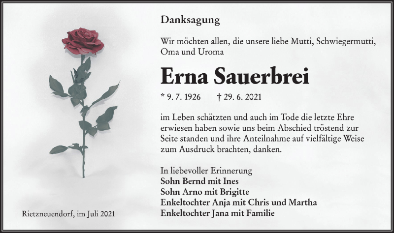 Hier finden Sie alle Traueranzeigen aus der Zeitung, die bisher für Erna Sauerbrei erschienen sind. Weitere Traueranzeigen, die in der Zeitung erscheinen, werden hier ebenfalls aufgelistet