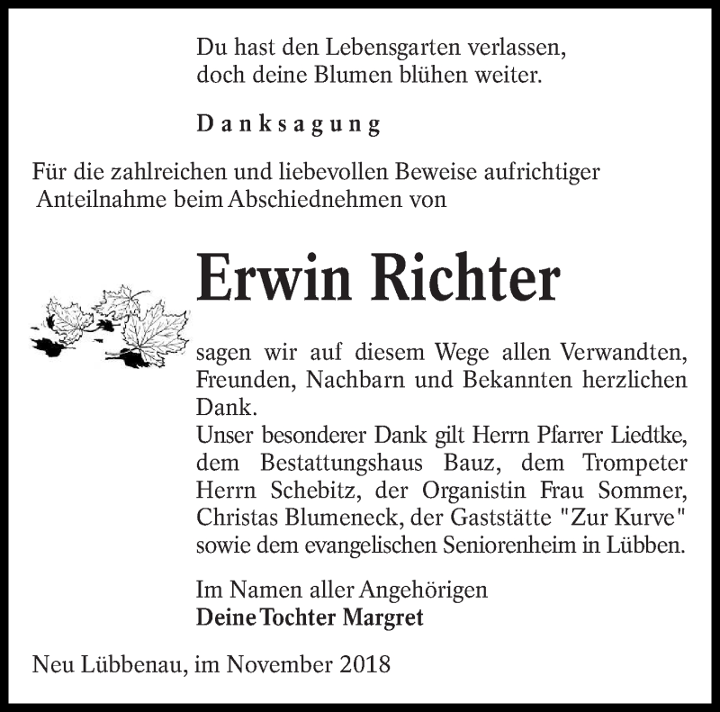 Hier finden Sie alle Traueranzeigen aus der Zeitung, die bisher für Erwin Richter erschienen sind. Weitere Traueranzeigen, die in der Zeitung erscheinen, werden hier ebenfalls aufgelistet