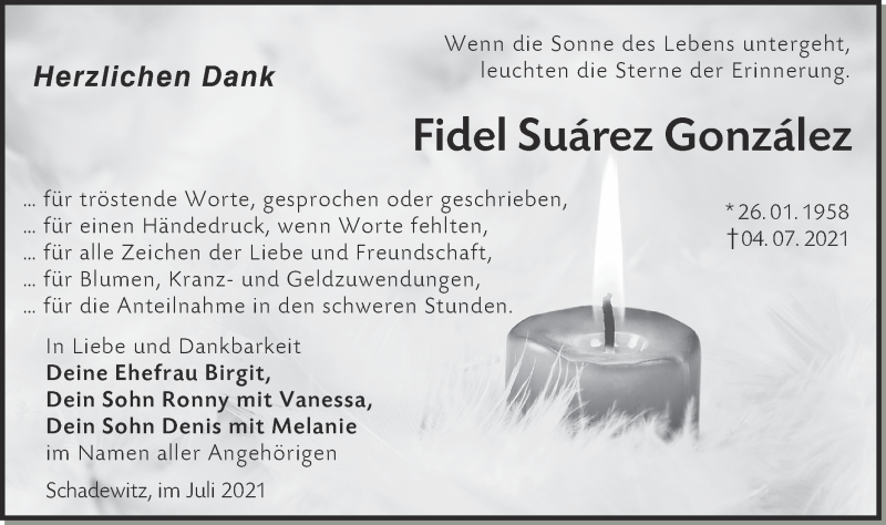 Hier finden Sie alle Traueranzeigen aus der Zeitung, die bisher für Fidel Suárez González erschienen sind. Weitere Traueranzeigen, die in der Zeitung erscheinen, werden hier ebenfalls aufgelistet