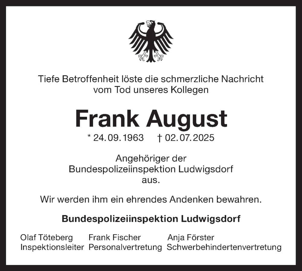 Hier finden Sie alle Traueranzeigen aus der Zeitung, die bisher für Frank August erschienen sind. Weitere Traueranzeigen, die in der Zeitung erscheinen, werden hier ebenfalls aufgelistet