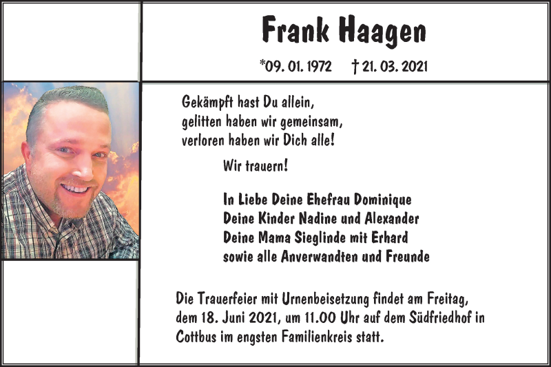 Hier finden Sie alle Traueranzeigen aus der Zeitung, die bisher für Frank Haagen erschienen sind. Weitere Traueranzeigen, die in der Zeitung erscheinen, werden hier ebenfalls aufgelistet