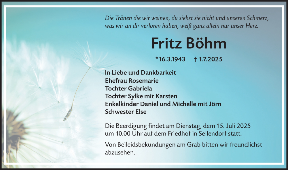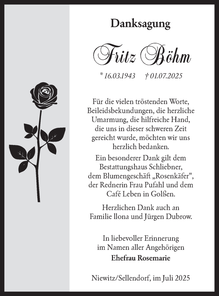 Hier finden Sie alle Traueranzeigen aus der Zeitung, die bisher für Fritz Böhm erschienen sind. Weitere Traueranzeigen, die in der Zeitung erscheinen, werden hier ebenfalls aufgelistet