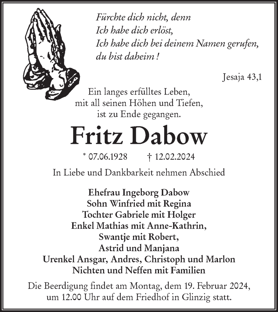 Hier finden Sie alle Traueranzeigen aus der Zeitung, die bisher für Fritz Dabow erschienen sind. Weitere Traueranzeigen, die in der Zeitung erscheinen, werden hier ebenfalls aufgelistet