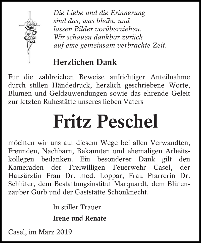 Hier finden Sie alle Traueranzeigen aus der Zeitung, die bisher für Fritz Peschel erschienen sind. Weitere Traueranzeigen, die in der Zeitung erscheinen, werden hier ebenfalls aufgelistet