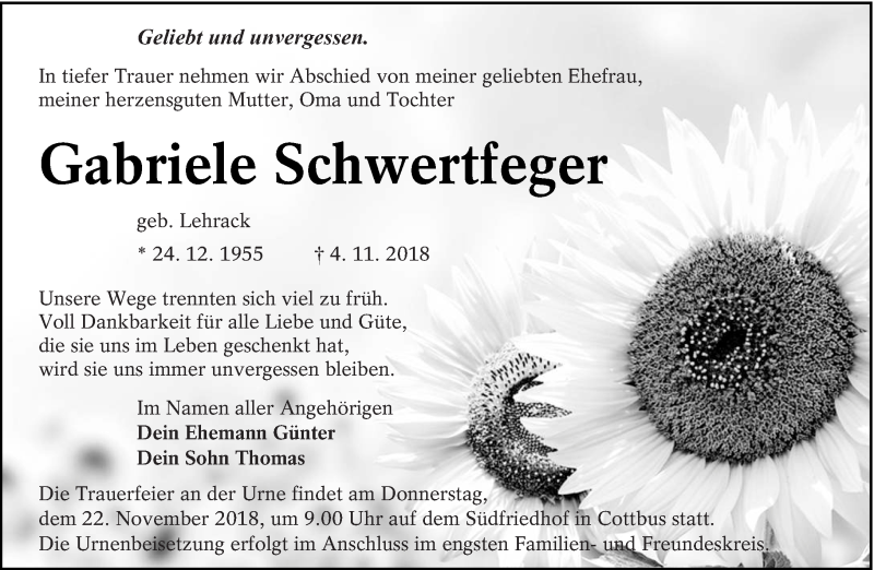 Hier finden Sie alle Traueranzeigen aus der Zeitung, die bisher für Gabriele Schwertfeger erschienen sind. Weitere Traueranzeigen, die in der Zeitung erscheinen, werden hier ebenfalls aufgelistet
