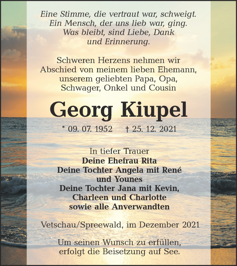 Hier finden Sie alle Traueranzeigen aus der Zeitung, die bisher für Georg Kiupel erschienen sind. Weitere Traueranzeigen, die in der Zeitung erscheinen, werden hier ebenfalls aufgelistet