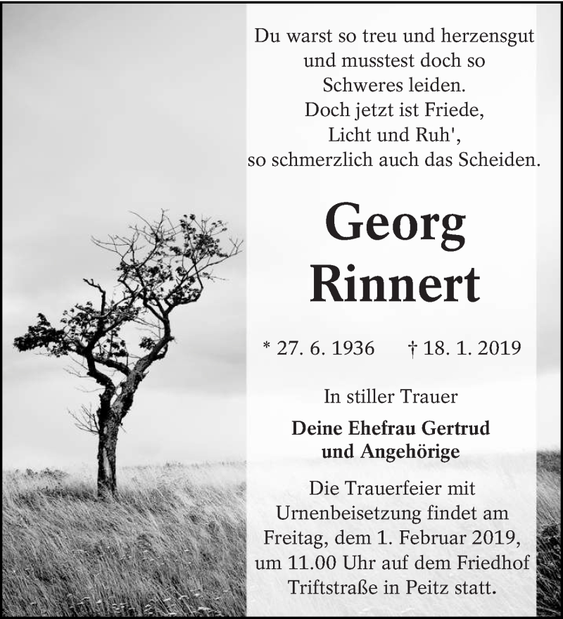 Hier finden Sie alle Traueranzeigen aus der Zeitung, die bisher für Georg Rinnert erschienen sind. Weitere Traueranzeigen, die in der Zeitung erscheinen, werden hier ebenfalls aufgelistet