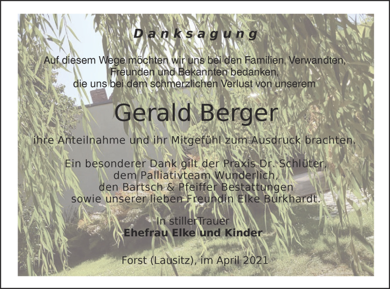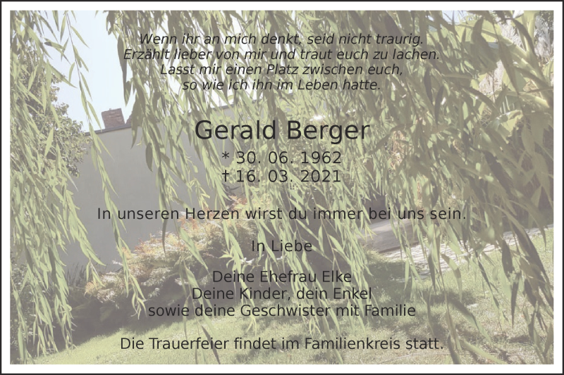 Hier finden Sie alle Traueranzeigen aus der Zeitung, die bisher für Gerald Berger erschienen sind. Weitere Traueranzeigen, die in der Zeitung erscheinen, werden hier ebenfalls aufgelistet