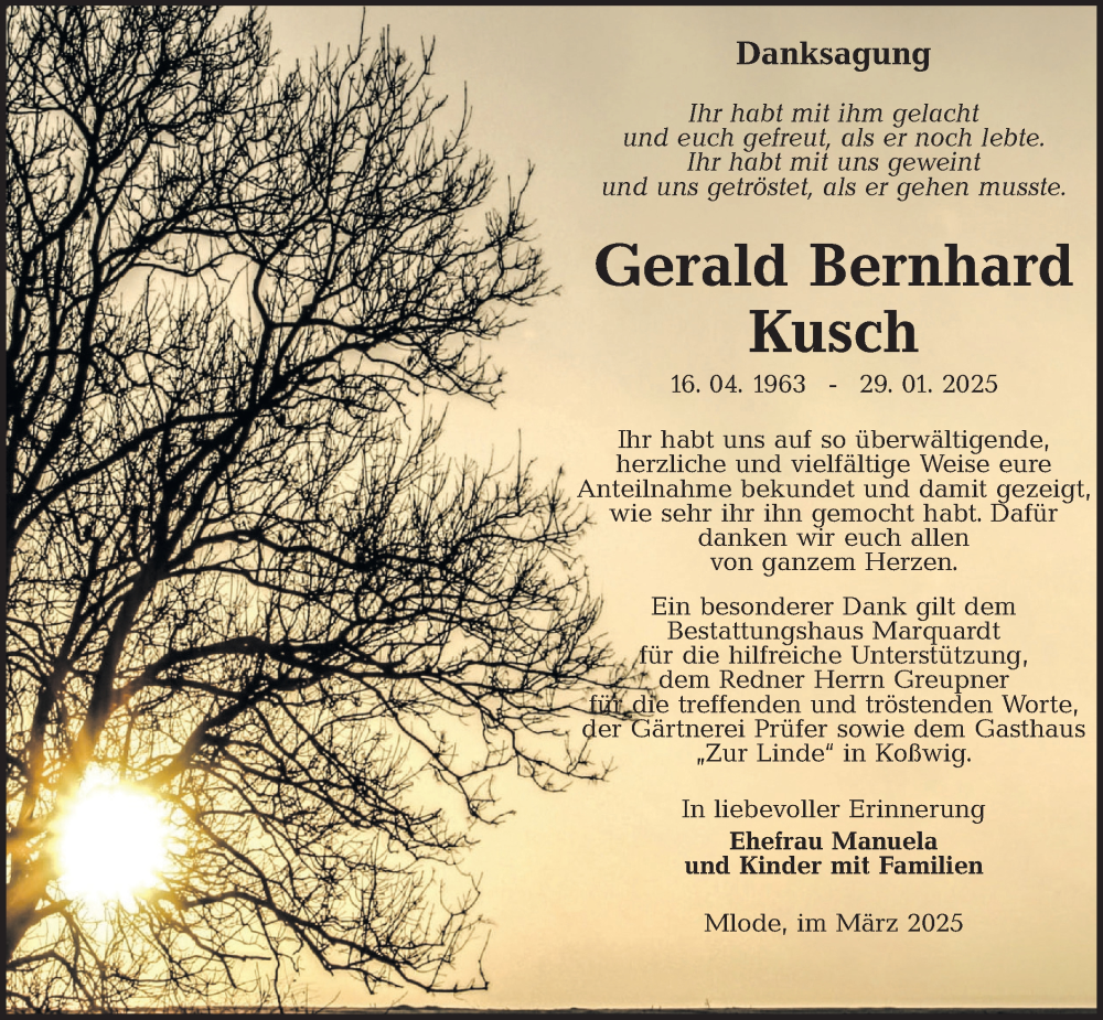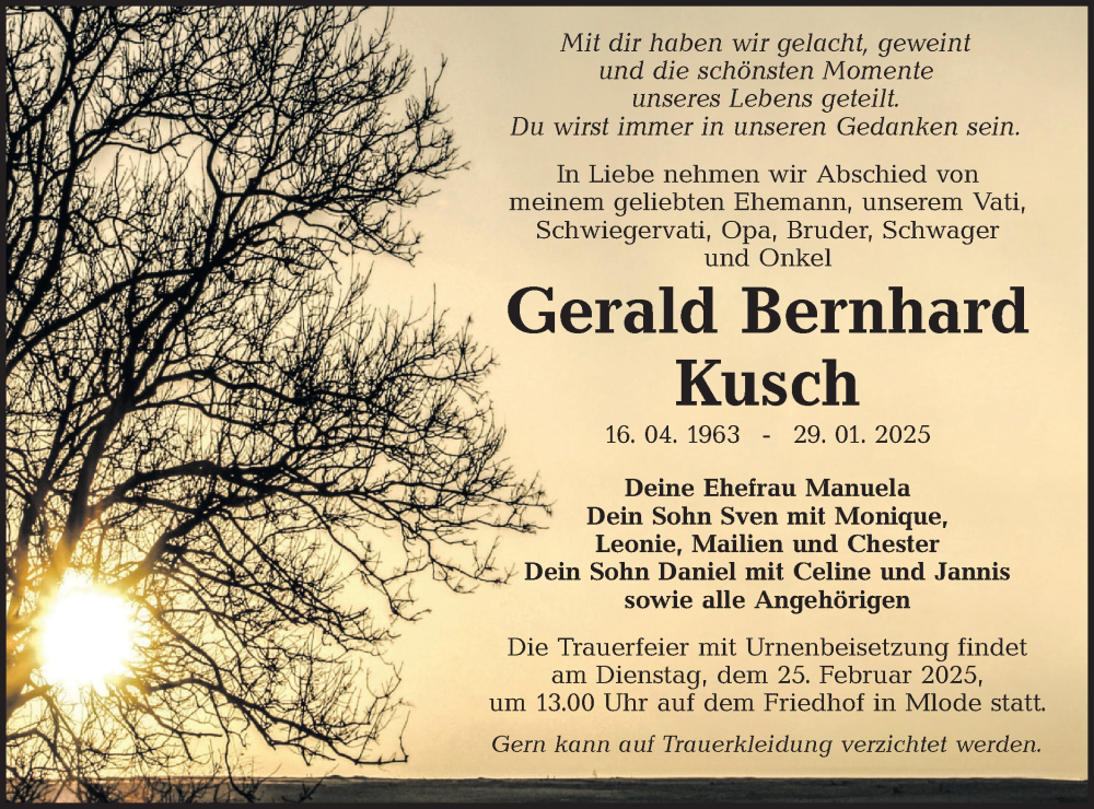Hier finden Sie alle Traueranzeigen aus der Zeitung, die bisher für Gerald Bernhard Kusch erschienen sind. Weitere Traueranzeigen, die in der Zeitung erscheinen, werden hier ebenfalls aufgelistet