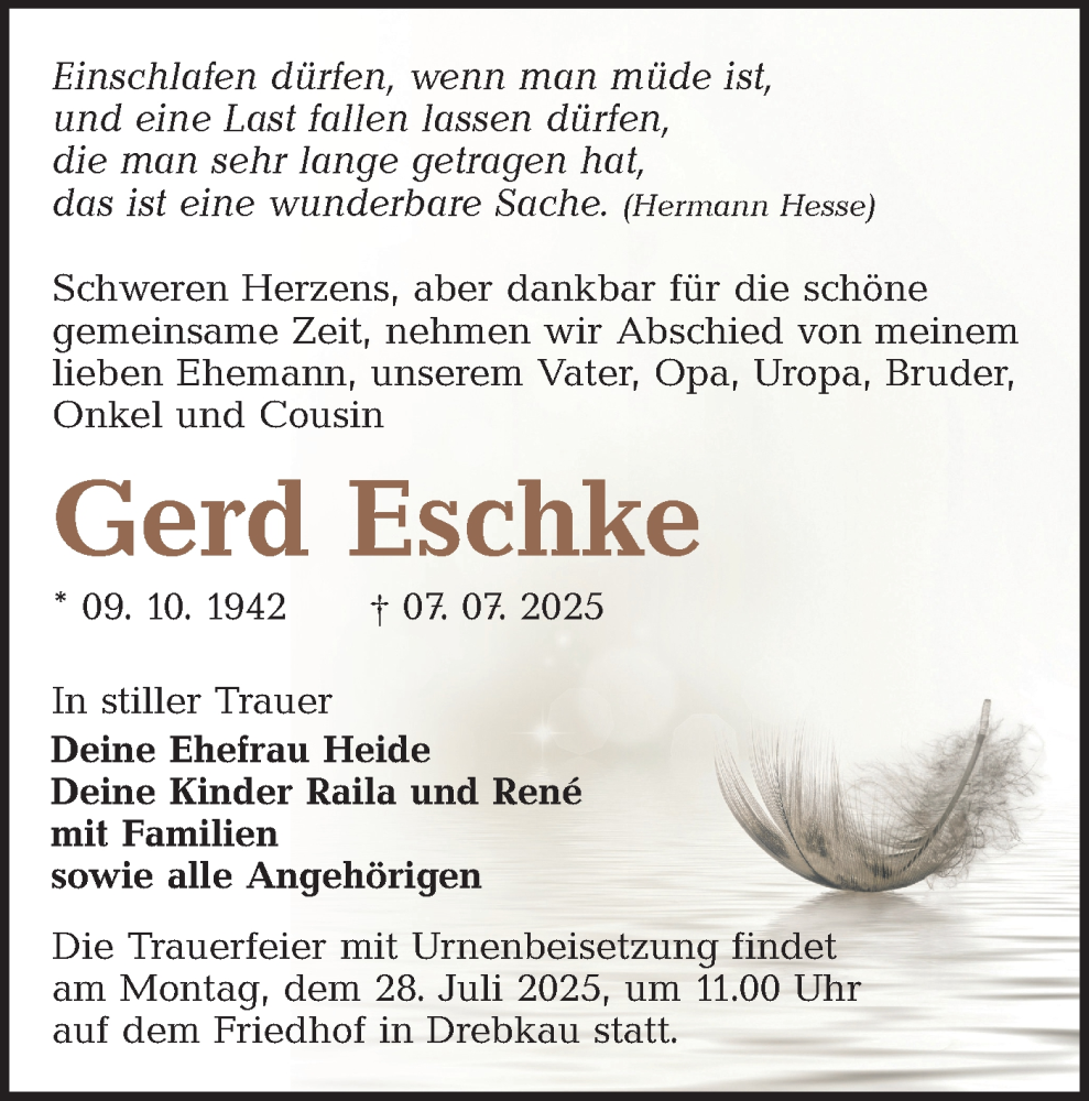Hier finden Sie alle Traueranzeigen aus der Zeitung, die bisher für Gerd Eschke erschienen sind. Weitere Traueranzeigen, die in der Zeitung erscheinen, werden hier ebenfalls aufgelistet