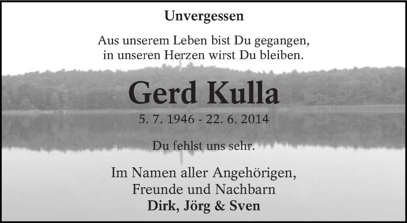 Hier finden Sie alle Traueranzeigen aus der Zeitung, die bisher für Gerd Kulla erschienen sind. Weitere Traueranzeigen, die in der Zeitung erscheinen, werden hier ebenfalls aufgelistet