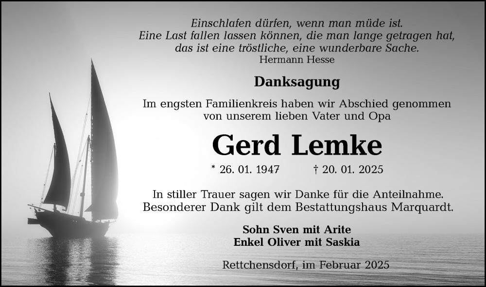 Hier finden Sie alle Traueranzeigen aus der Zeitung, die bisher für Gerd Lemke erschienen sind. Weitere Traueranzeigen, die in der Zeitung erscheinen, werden hier ebenfalls aufgelistet