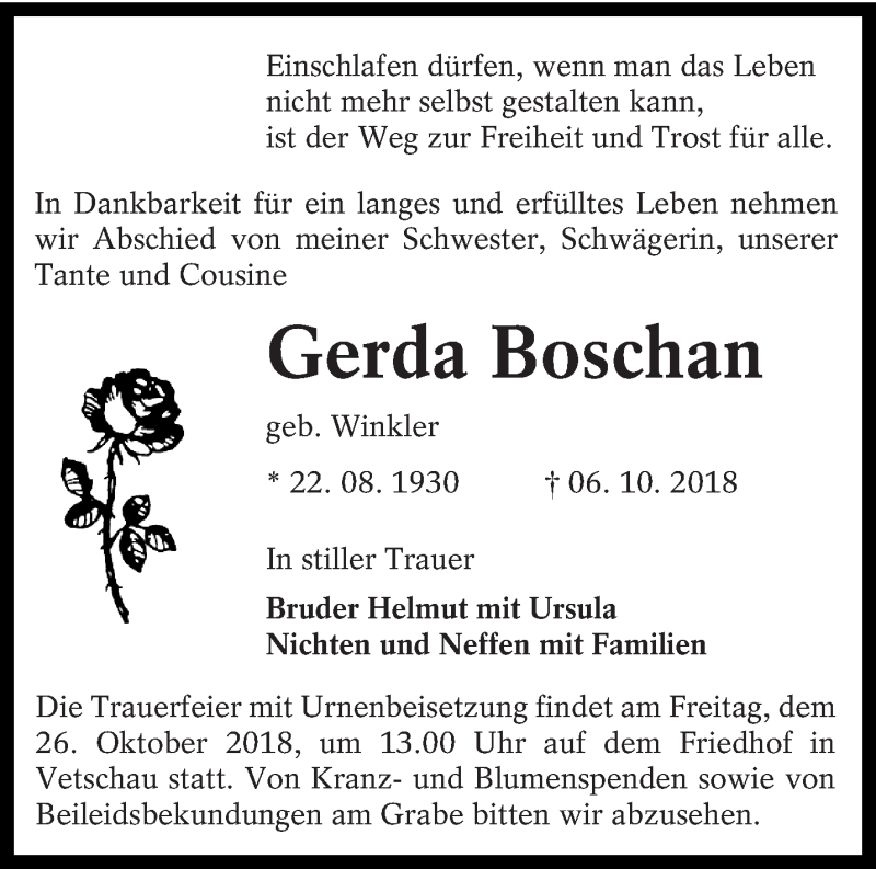 Hier finden Sie alle Traueranzeigen aus der Zeitung, die bisher für Gerda Boschan erschienen sind. Weitere Traueranzeigen, die in der Zeitung erscheinen, werden hier ebenfalls aufgelistet