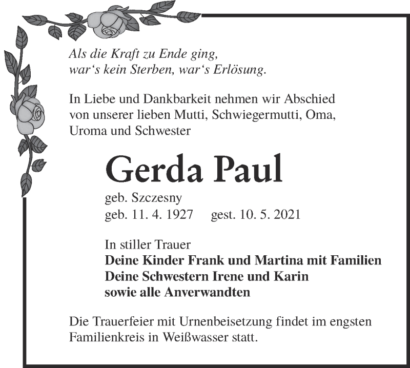 Hier finden Sie alle Traueranzeigen aus der Zeitung, die bisher für Gerda Paul erschienen sind. Weitere Traueranzeigen, die in der Zeitung erscheinen, werden hier ebenfalls aufgelistet