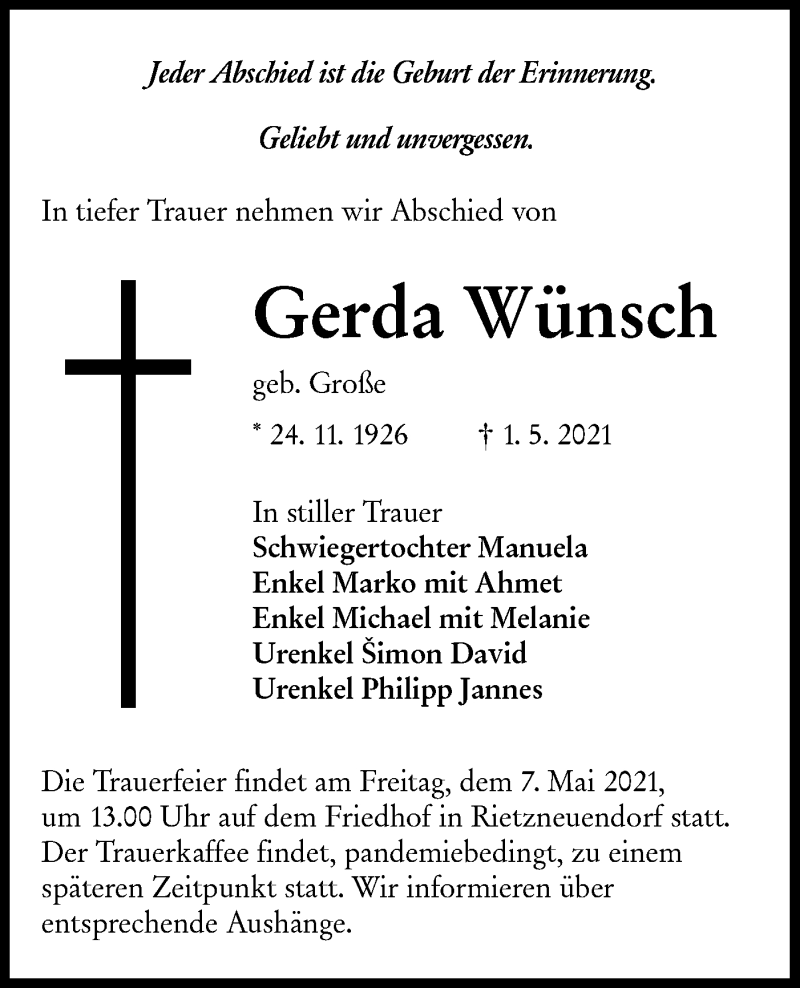 Hier finden Sie alle Traueranzeigen aus der Zeitung, die bisher für Gerda Wünsch erschienen sind. Weitere Traueranzeigen, die in der Zeitung erscheinen, werden hier ebenfalls aufgelistet