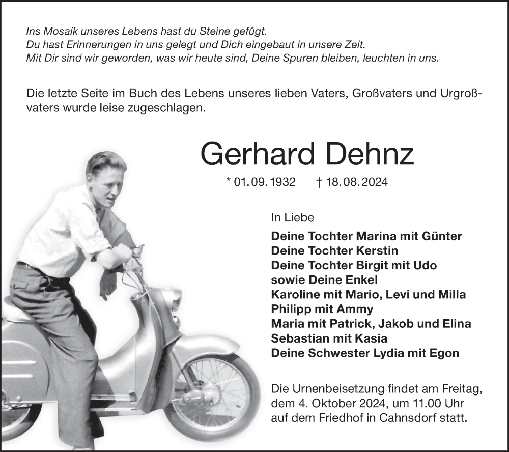 Hier finden Sie alle Traueranzeigen aus der Zeitung, die bisher für Gerhard Dehnz erschienen sind. Weitere Traueranzeigen, die in der Zeitung erscheinen, werden hier ebenfalls aufgelistet