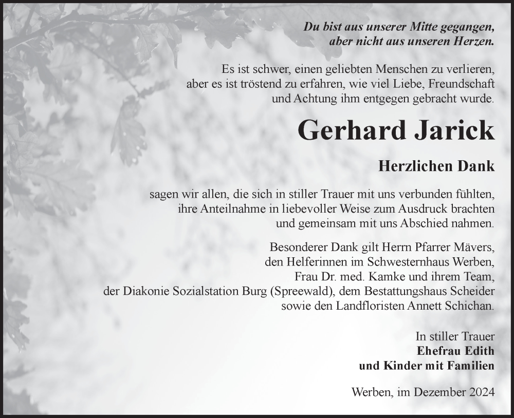Hier finden Sie alle Traueranzeigen aus der Zeitung, die bisher für Gerhard Jarick erschienen sind. Weitere Traueranzeigen, die in der Zeitung erscheinen, werden hier ebenfalls aufgelistet