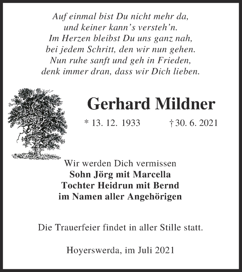 Hier finden Sie alle Traueranzeigen aus der Zeitung, die bisher für Gerhard Mildner erschienen sind. Weitere Traueranzeigen, die in der Zeitung erscheinen, werden hier ebenfalls aufgelistet