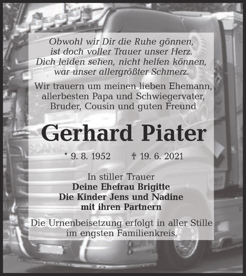 Hier finden Sie alle Traueranzeigen aus der Zeitung, die bisher für Gerhard Piater erschienen sind. Weitere Traueranzeigen, die in der Zeitung erscheinen, werden hier ebenfalls aufgelistet
