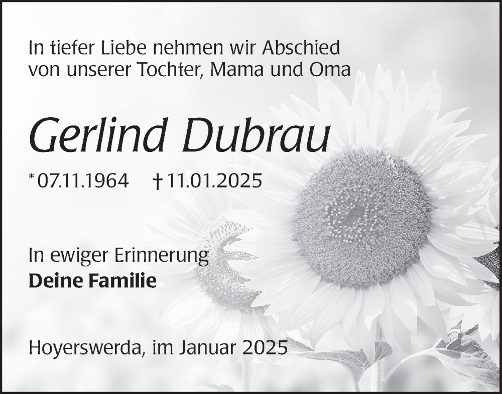 Hier finden Sie alle Traueranzeigen aus der Zeitung, die bisher für Gerlind Dubrau erschienen sind. Weitere Traueranzeigen, die in der Zeitung erscheinen, werden hier ebenfalls aufgelistet