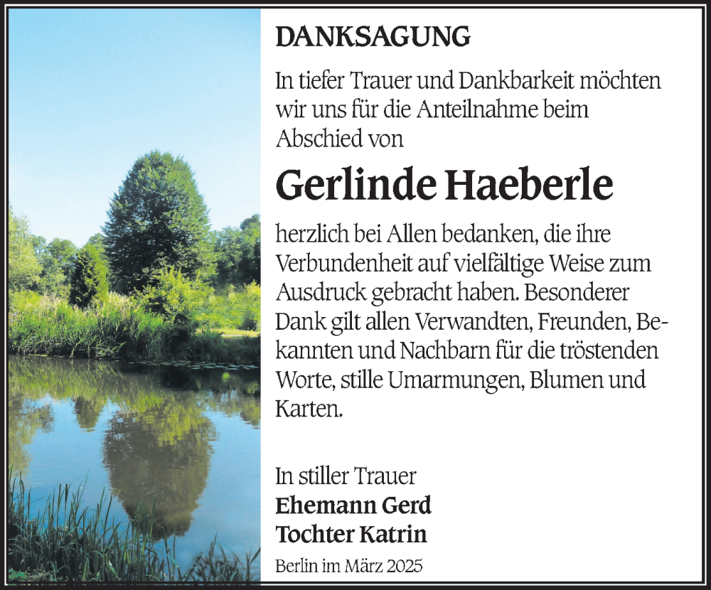 Hier finden Sie alle Traueranzeigen aus der Zeitung, die bisher für Gerlinde Haeberle erschienen sind. Weitere Traueranzeigen, die in der Zeitung erscheinen, werden hier ebenfalls aufgelistet