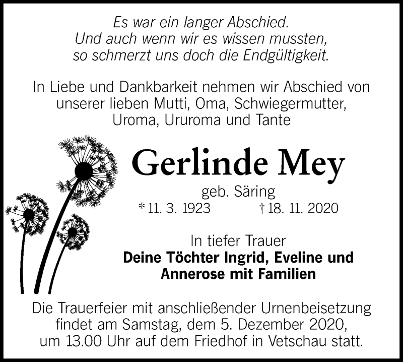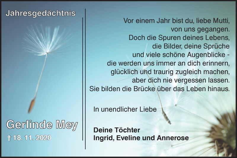 Hier finden Sie alle Traueranzeigen aus der Zeitung, die bisher für Gerlinde Mey erschienen sind. Weitere Traueranzeigen, die in der Zeitung erscheinen, werden hier ebenfalls aufgelistet