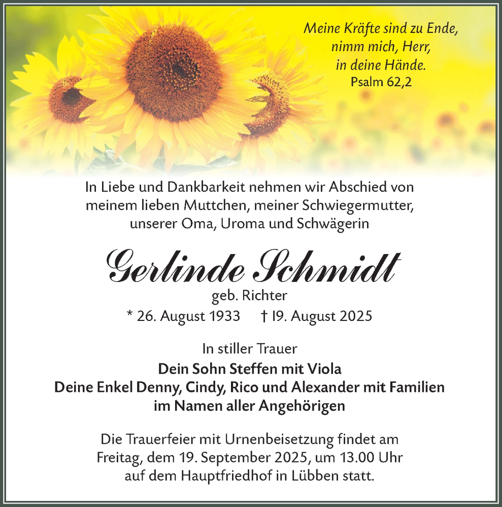 Hier finden Sie alle Traueranzeigen aus der Zeitung, die bisher für Gerlinde Schmidt erschienen sind. Weitere Traueranzeigen, die in der Zeitung erscheinen, werden hier ebenfalls aufgelistet