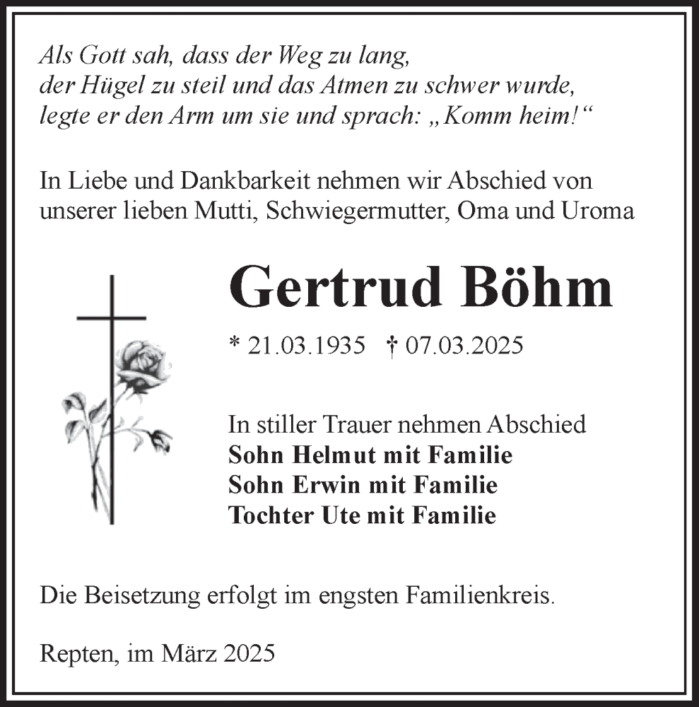 Hier finden Sie alle Traueranzeigen aus der Zeitung, die bisher für Gertrud Böhm erschienen sind. Weitere Traueranzeigen, die in der Zeitung erscheinen, werden hier ebenfalls aufgelistet
