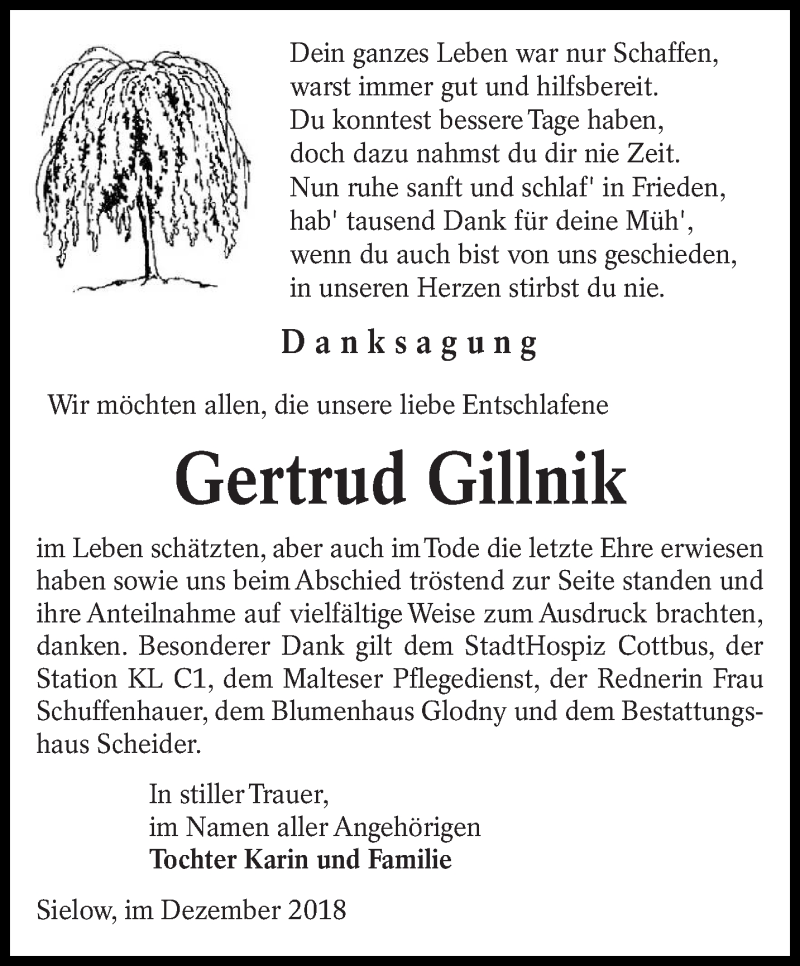 Hier finden Sie alle Traueranzeigen aus der Zeitung, die bisher für Gertrud Gillnik erschienen sind. Weitere Traueranzeigen, die in der Zeitung erscheinen, werden hier ebenfalls aufgelistet