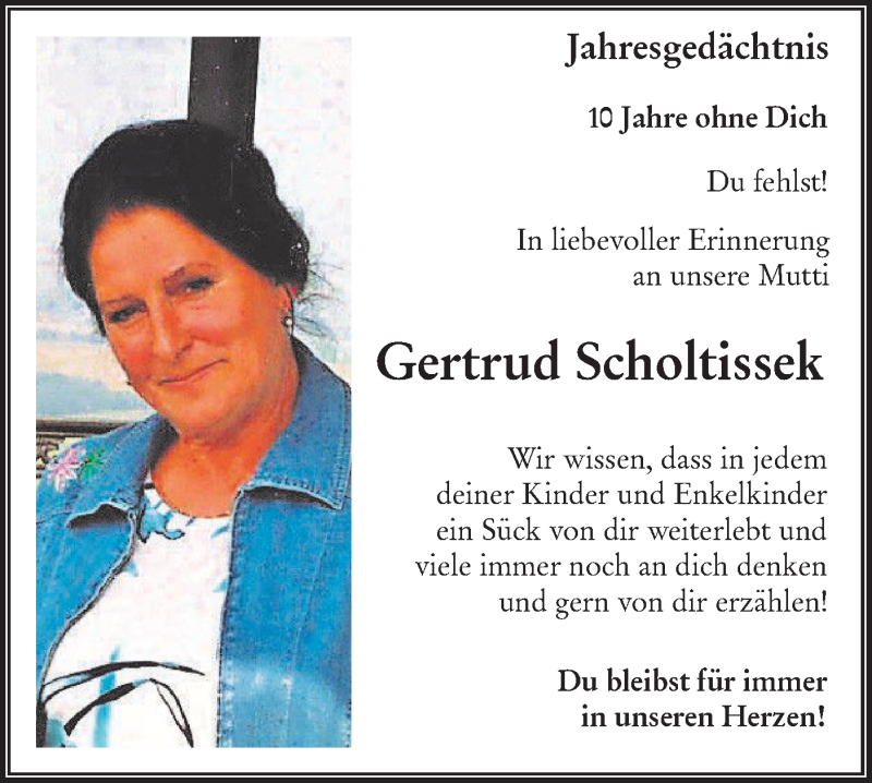 Hier finden Sie alle Traueranzeigen aus der Zeitung, die bisher für Gertrud Scholtissek erschienen sind. Weitere Traueranzeigen, die in der Zeitung erscheinen, werden hier ebenfalls aufgelistet