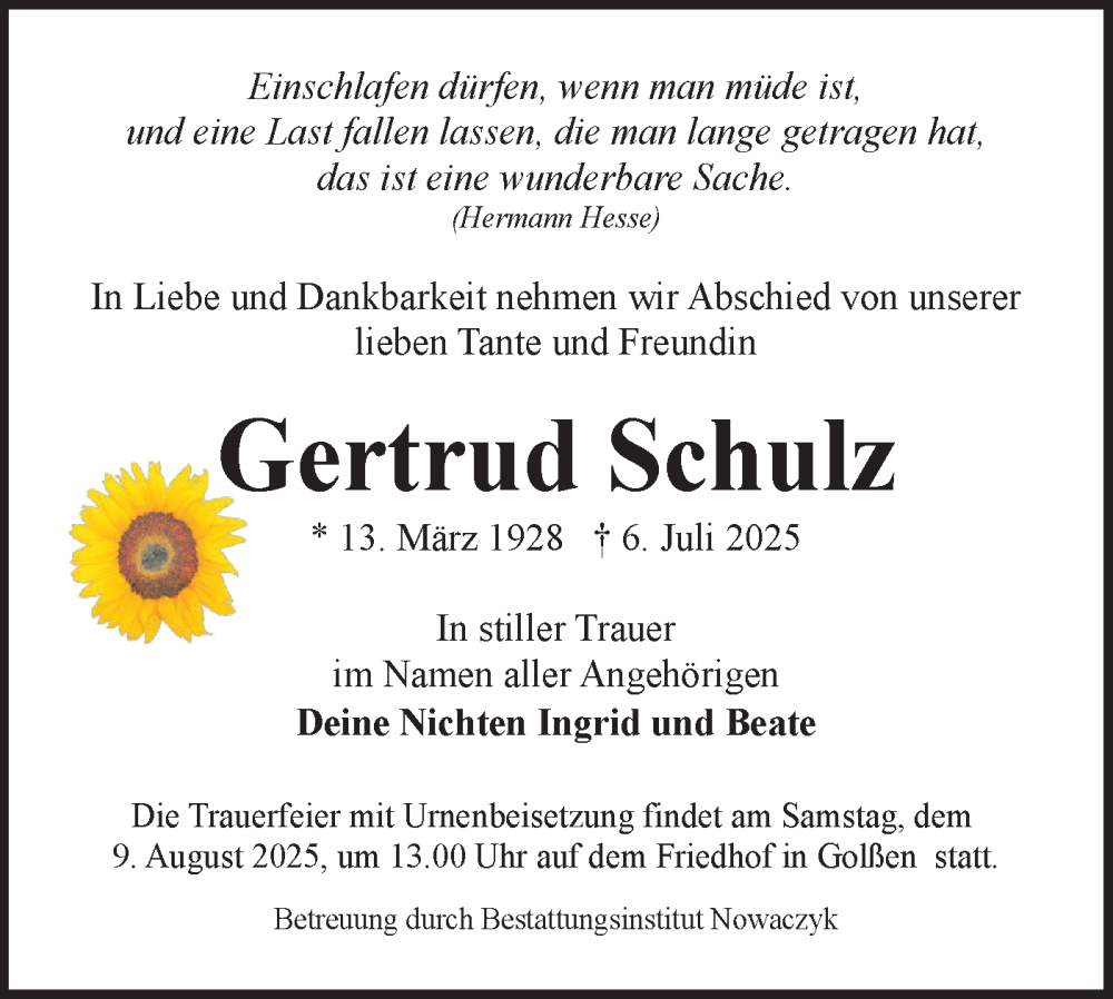 Hier finden Sie alle Traueranzeigen aus der Zeitung, die bisher für Gertrud Schulz erschienen sind. Weitere Traueranzeigen, die in der Zeitung erscheinen, werden hier ebenfalls aufgelistet
